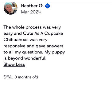 Please enjoy our reviews from previous customers below! And if you have done business with us and have a "Cupcake" puppy, please let others know about your experience! We aim to provide a healthy, happy puppy to all of our customers and the best experience while looking for the perfect furbaby. We would love to hear from you and see a picture of your sweet pup!